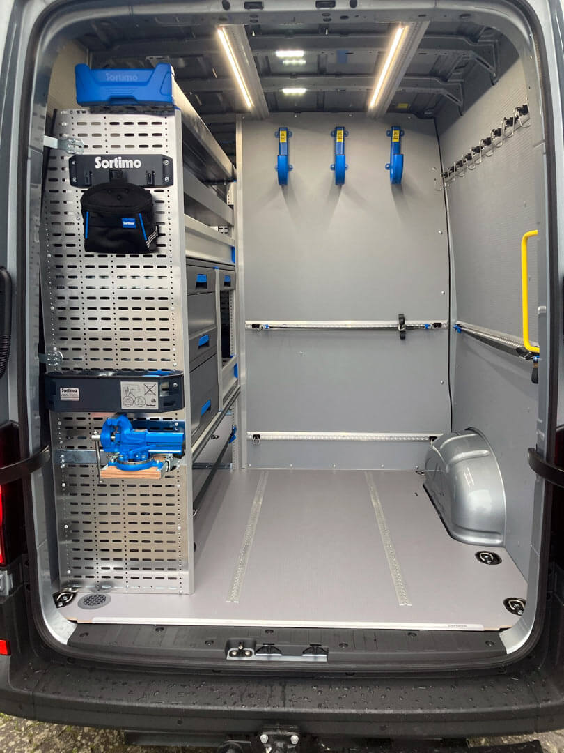 Wir haben eine Trennwand als Sonderanfertigung installiert, sodass man die Bereiche gut getrennt hat. Im hinteren Teil des Fahrzeuges wurden einige Elemente der Ladungssicherung verbaut. Ebenso fand hier ein großzügiges Globelyst-Regal seinen Platz. Die Besonderheit ist, dass man es sowohl aus dem Laderaum, als auch über die seitliche Schiebetür erreichen kann.